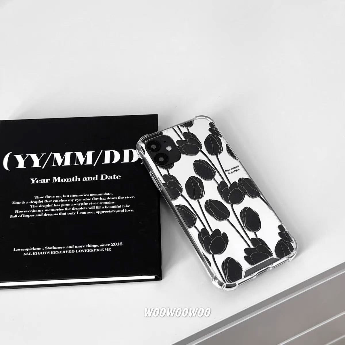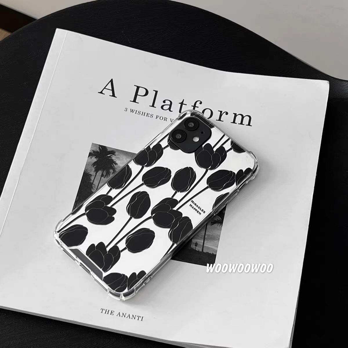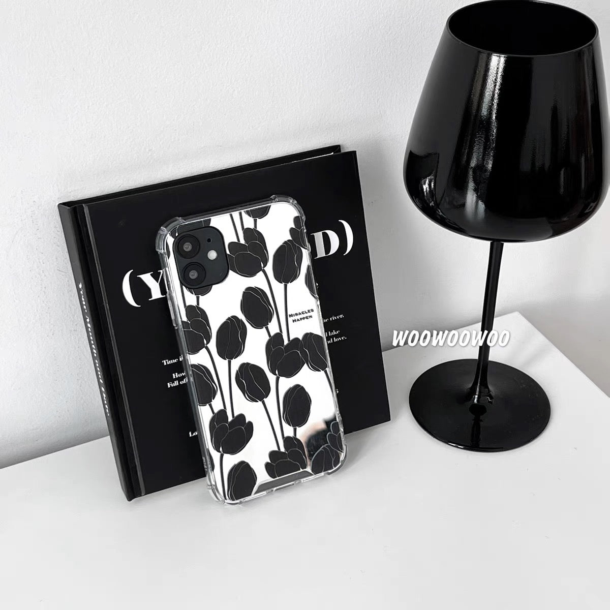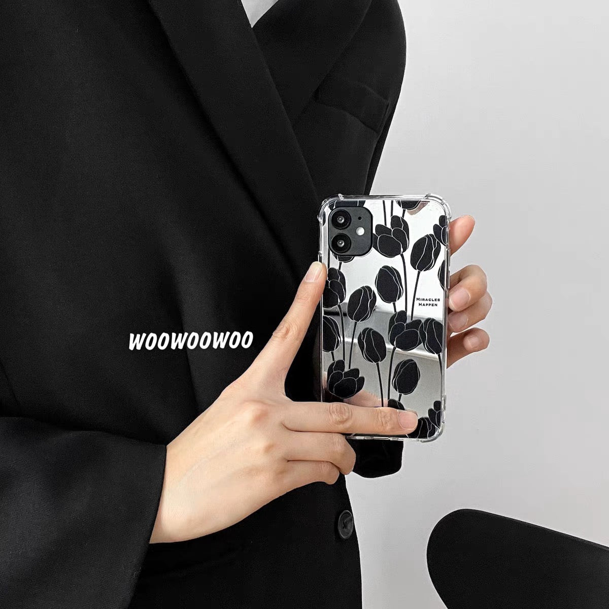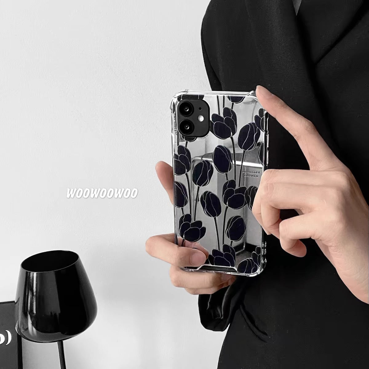 iPhoneケース おしゃれ ブラック フラワー ミラー付き スマホケース