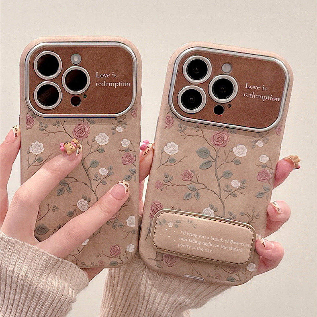 iPhoneケース かわいい フラワー スタンド付き ブラウン スマホケース