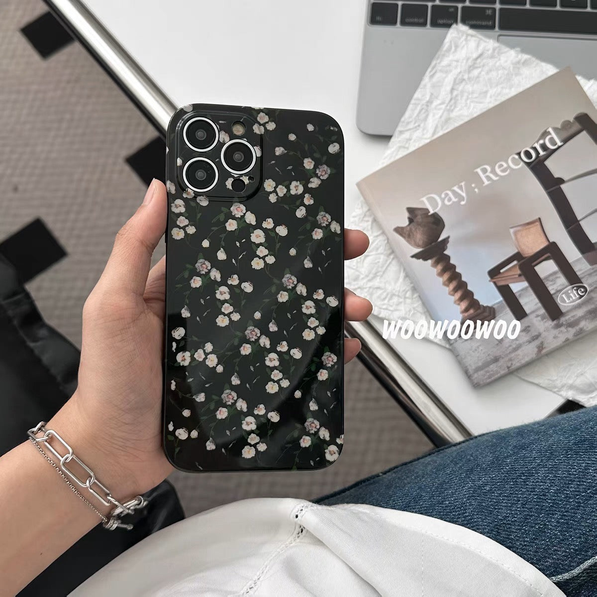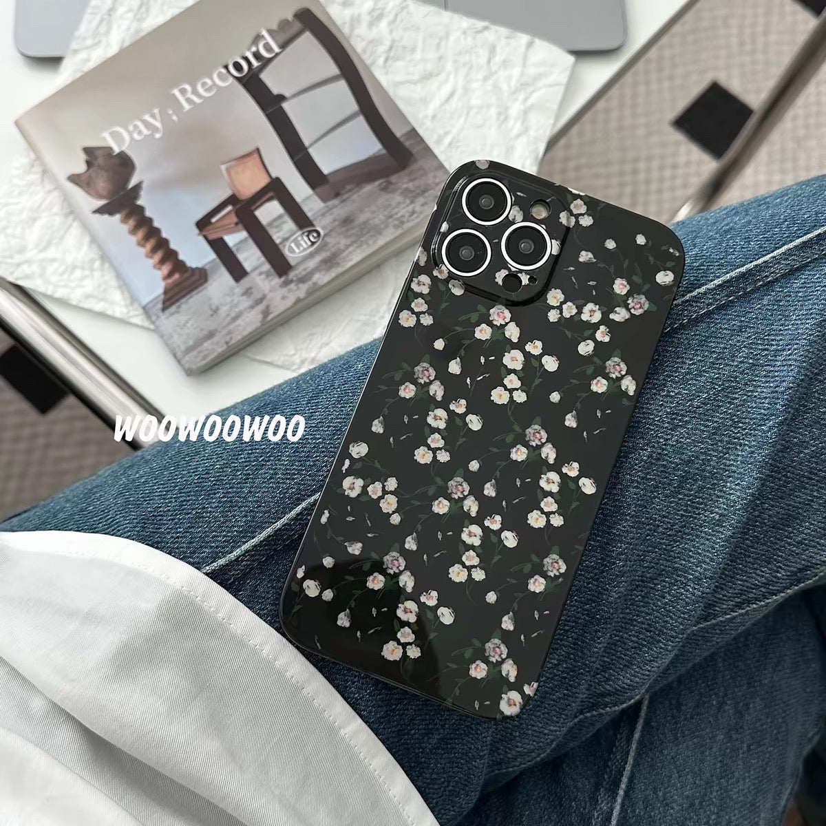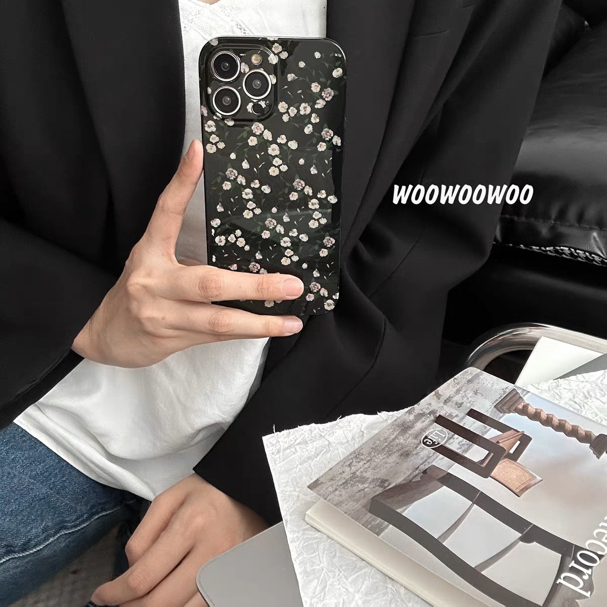 iPhoneケース おしゃれ ホワイト フラワー ブラック スマホケース