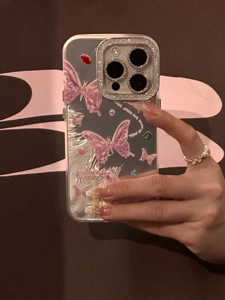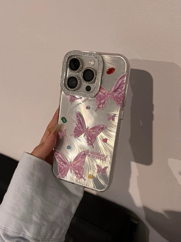 iPhoneケース かわいい ピンク 蝶々 シルバー スマホケース
