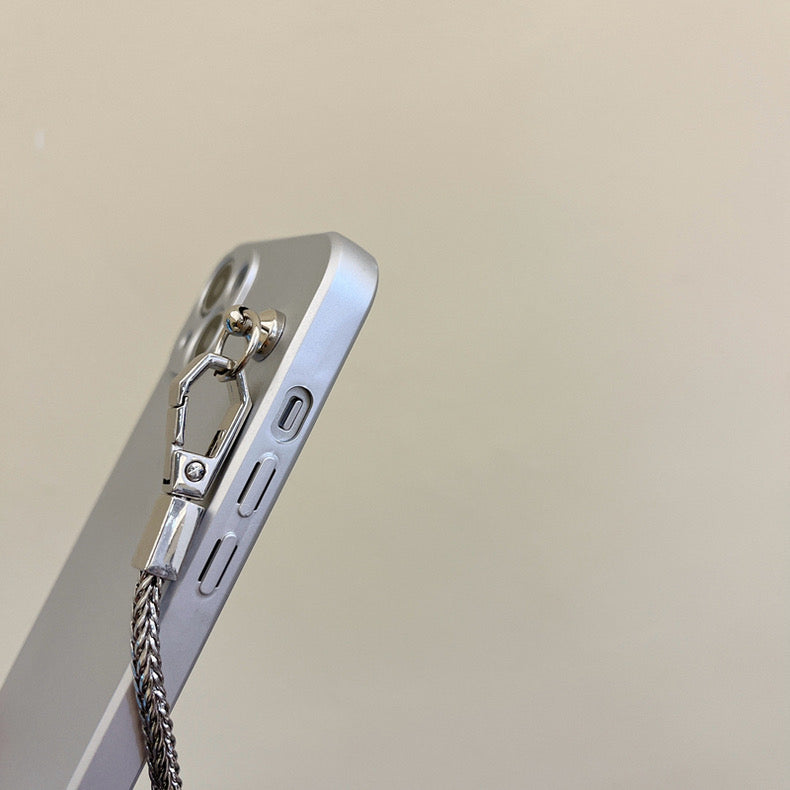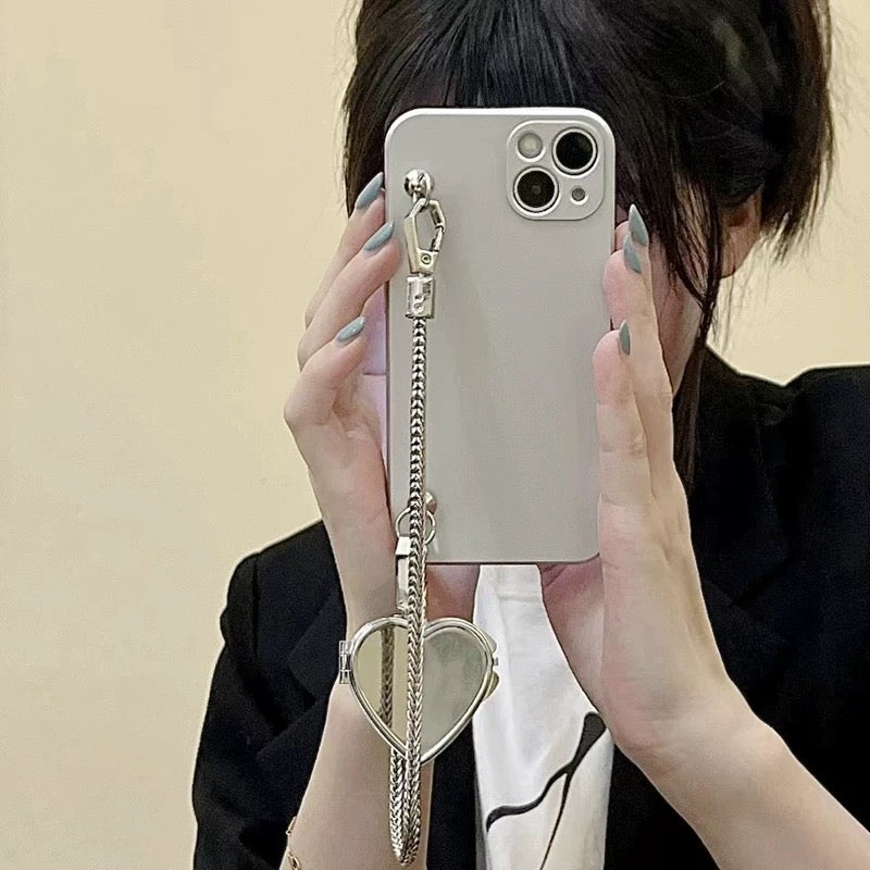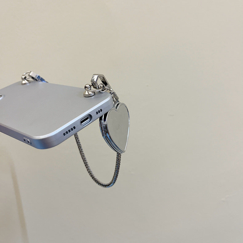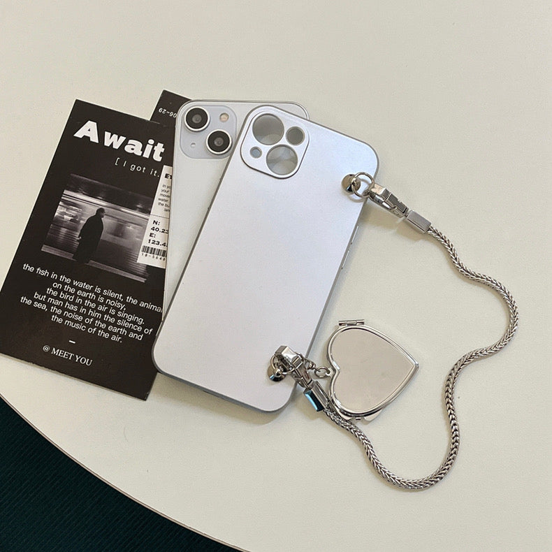 iPhoneケース 持ち手付き ハート鏡付き シンプル シルバー スマホケース